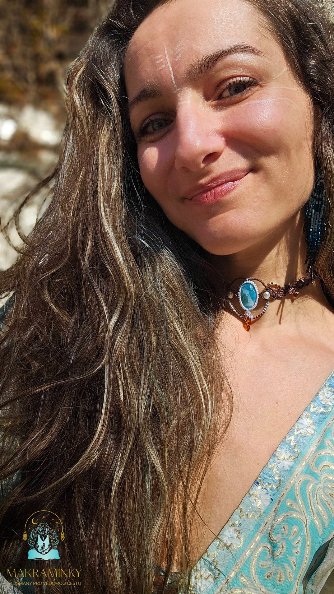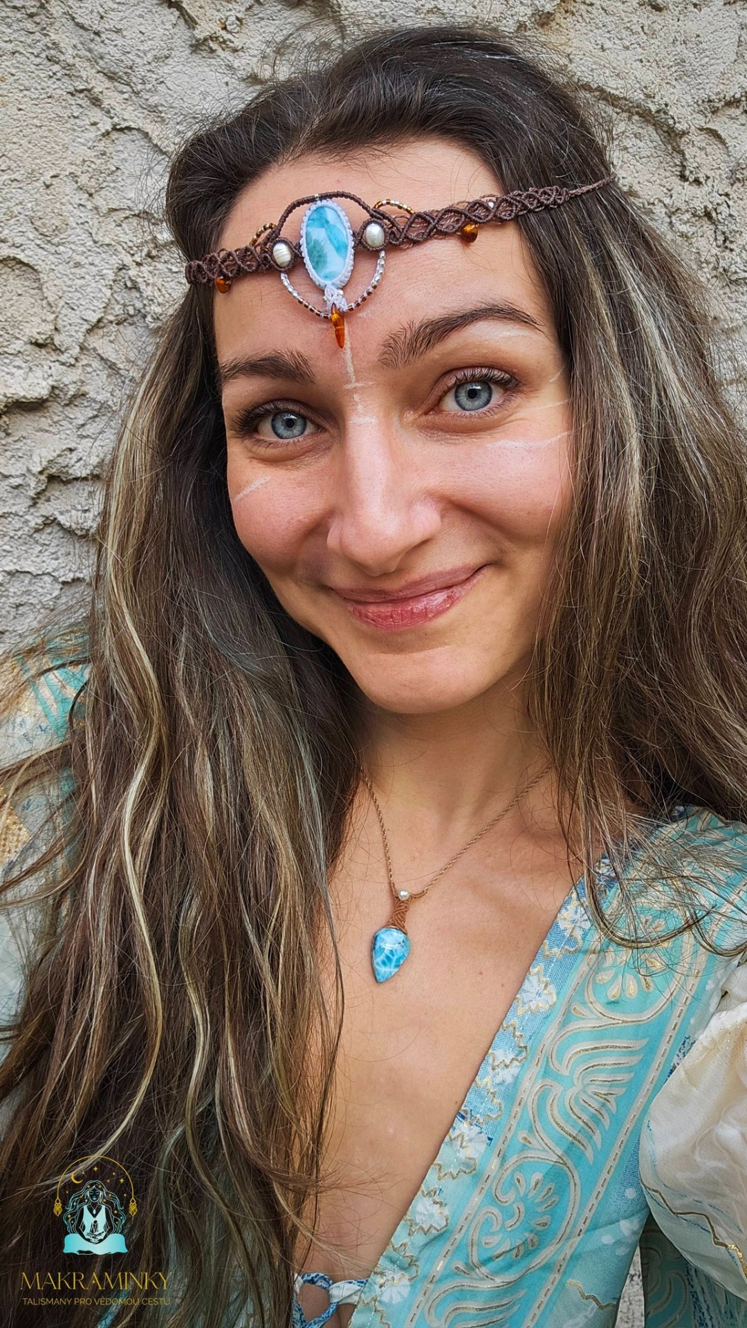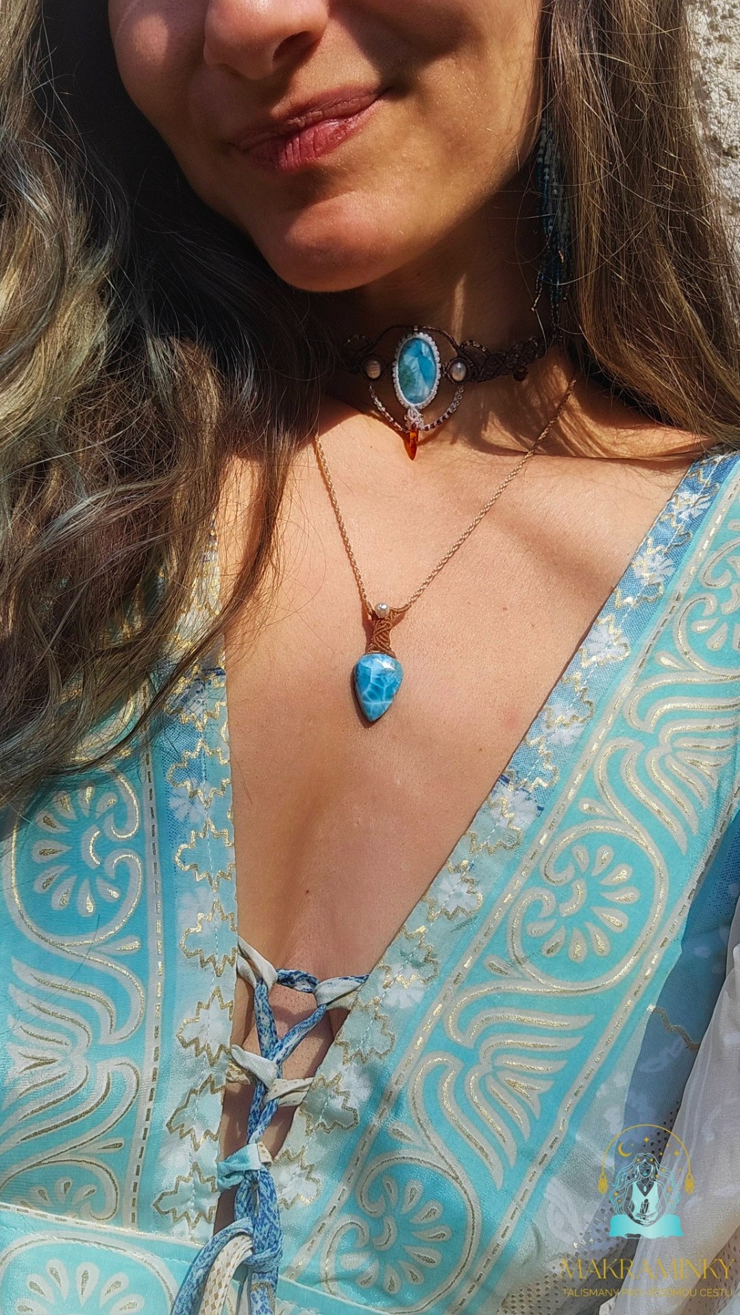 Prvotřídní krásně sytý Larimar o vel.cca 3cm spolu s jantary a perlami tvoří jedinečnou posilující a ukotvující symbiózu. Přináší nadhled, zklidnění i odvahu. Komponenty jsou sklo a pravé stříbro Ag925 a zlato 24k, a nejsou obsaženy žádné další kovy. Proto je celý šperk antialergenní. ❤️