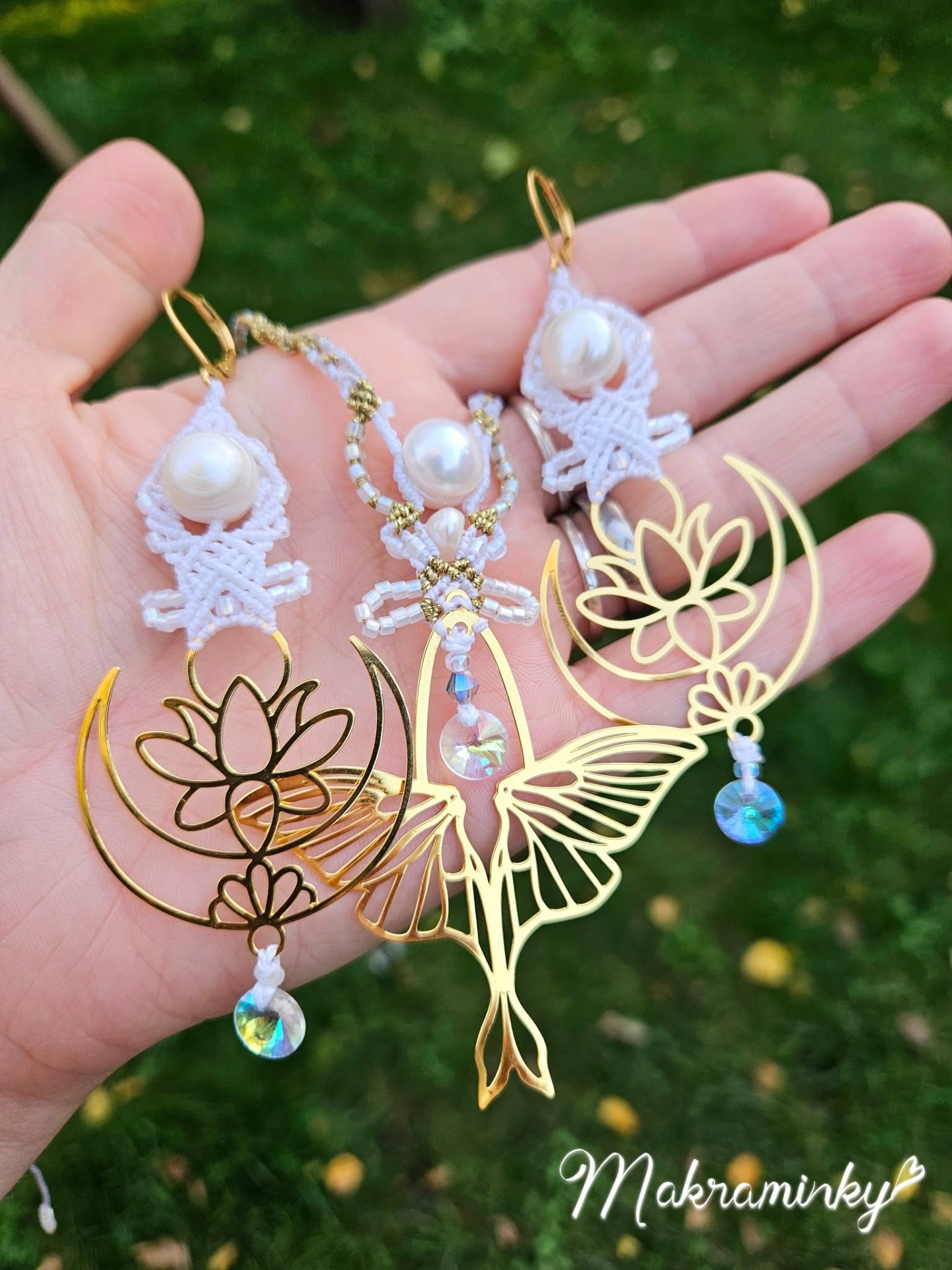 Andělská sada náušnice a náhrdelník - s pravými Říčními perlami, broušené křišťálky s duhovým leskem. Háčky i komponenty jsou z nerezové oceli (antialergenní provedení), k tomu navíc háčky jsou zavírací a pozlacené pravým zlatem. komponenty: skleněné lehoučké